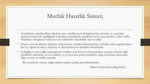 • Yemeklerin sunulacakları tabaklar yine sterilizasyon dolaplarından çıkarılır ve yemekler